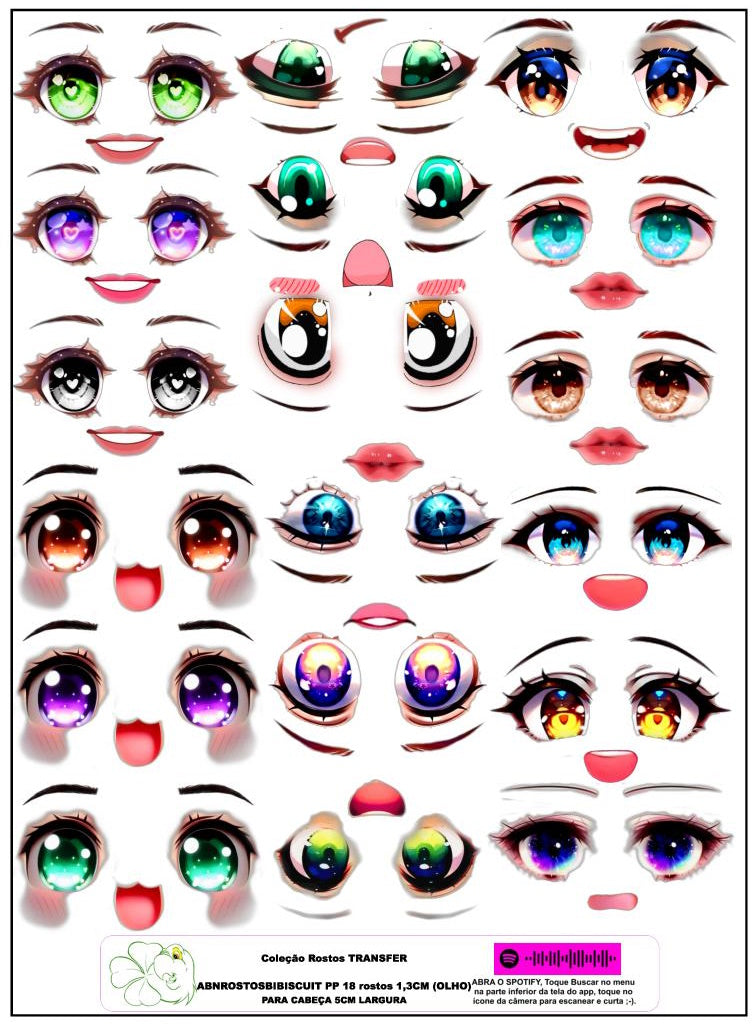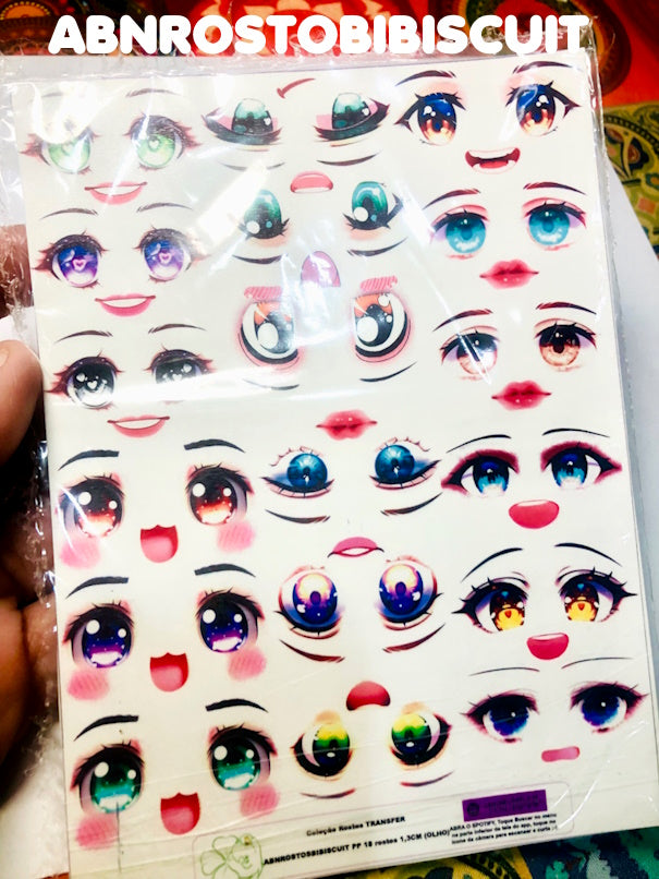 1. RECORTE E SEPARE DA CARTELA SOMENTE A IMAGEM À SER USADA. CARTELAS DE ROSTO E CILIOS GRANDES JÁ VÃO RECORTADAS, NÃO É NECESSÁRIO PRECISÃO NO CORTE (AO MOLHAR, ELA SE AUTODESTACARÁ NO CONTORNO CORRETO);